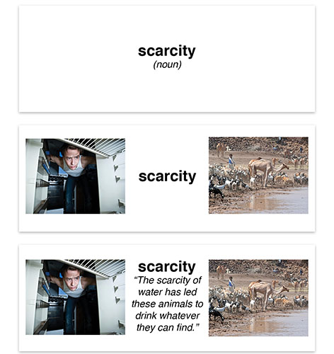 Round 2: Display the same word, this time accompanied by an image or object that illustrates the word’s meaning as used in the central text. This will help students distinguish between possible meanings. Students revise their prediction.