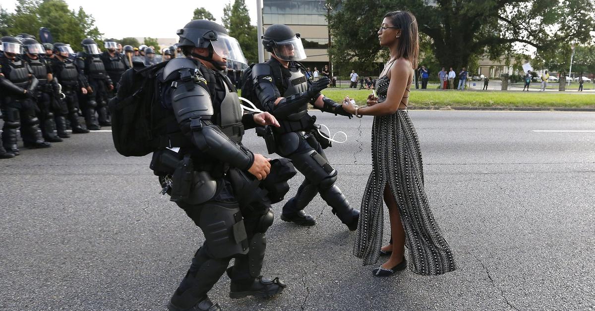 Protesting the death of Alton Sterling and the Baton Rouge Police Department’s request for Black Lives Matter demonstrators to clear roadways, Iesha Evans stands in the middle of a street as two Louisiana state troopers, dressed in riot gear, approach to arrest her. This photograph was taken by Jonathan Bachman on July 9, 2016.