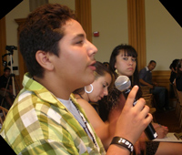 Jaime Sakr, tenth-grader at Life Academy addresses Assemblyman Gil Cedillo.