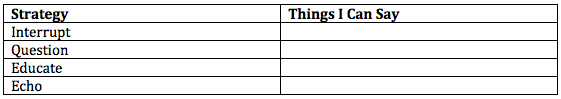 Read “Basic Strategies” (pgs. 18-23 in Speak Up At School) and add to the “Things You Can Say” column in the chart below any additional responses you or your students use. The pocket guide and Appendix A of Speak Up At School summarize strategies for speaking up against biased language in easy to reference locations.
