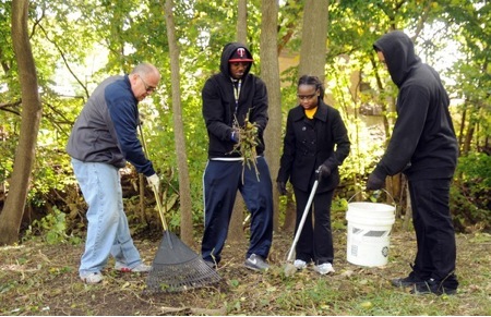 This image shows a group of high school students participating in a cleanup at a local park. Cleanup efforts represent action on multiple levels. They bring people together and generate conversations about community values and priorities. They combat environmental injustice, a major disparity issue that impacts people around the world. Cleanup efforts also equalize groups of people; everyone is engaged in a common—sometimes dirty—cause. Finally, a cleanup helps people value their community more deeply.